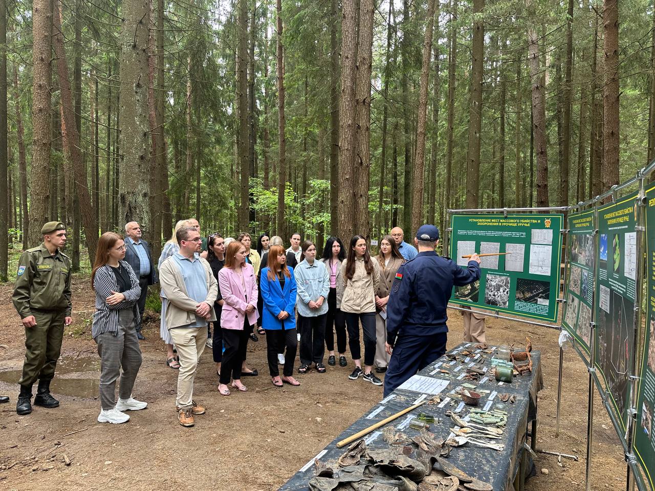 Сотрудников ГСУ познакомили с отдельными аспектами уголовного дела по факту геноцида населения Беларуси во время ВОВ и послевоенный период. С 2021 года на территории данного лесного массива обнаружено 13 ям-могил. В ямах найдены останки людей, пули и гильзы к огнестрельному оружию, а также личные вещи убитых.