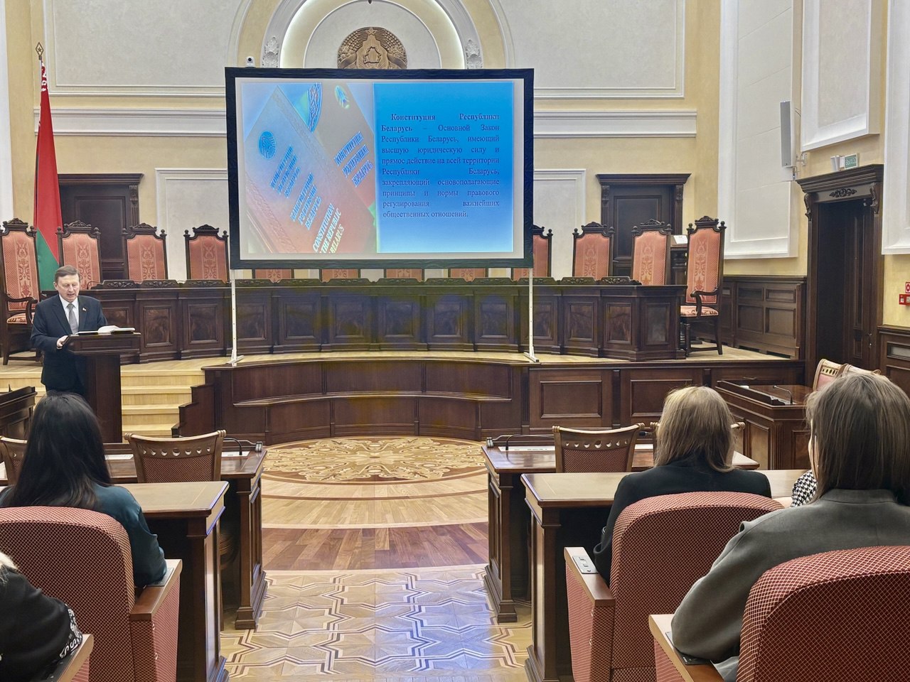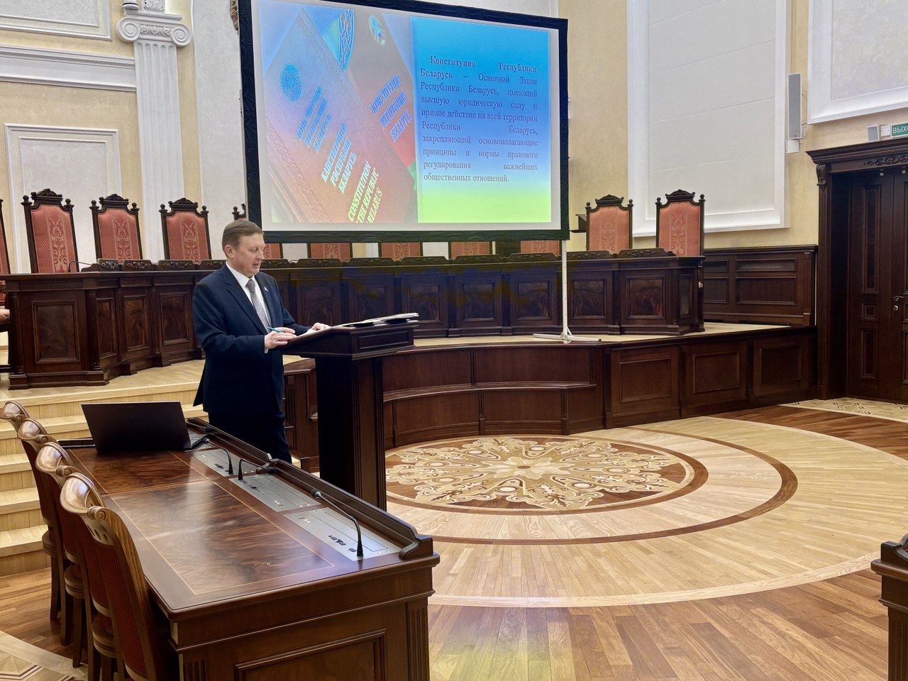 Тема выступления была посвящена основам Конституции Республики Беларусь, значению конституционных норм и процессу принятия решений высшей судебной инстанцией государства.